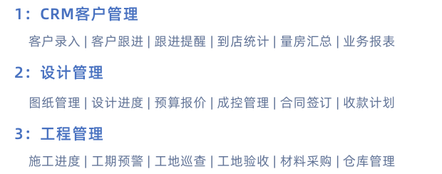 1:到店、量房、签单率低,客户流失、私单多。 2:设计方案完成不及时、存档不规范。 3:报价不规范、漏项、时效低,无法实现毛利管控。 4:工程管控难,协同差,收款不及时,材料内控差。
